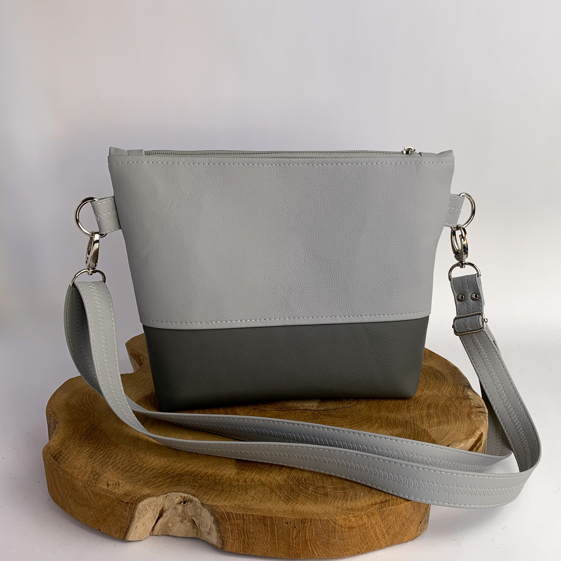 Beide Taschen haben oben einen Reißverschluss und einen verstellbaren Schultergurt (60–130 cm). Der Schultergurt ist ca. 2,5 cm breit und ebenfalls aus Kunstleder selbst genäht, passend zur Tasche.