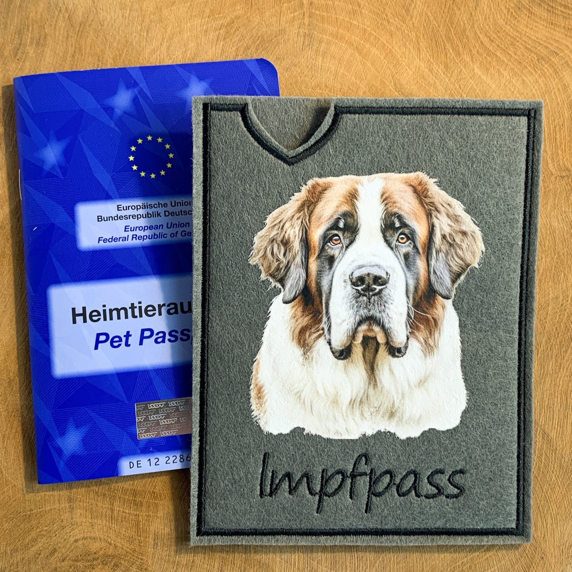 Mit unserer robusten und liebevoll gestalteten Impfpasshülle bleibt der Impfpass deines Bernhardiners geschützt, ordentlich verstaut und immer griffbereit.