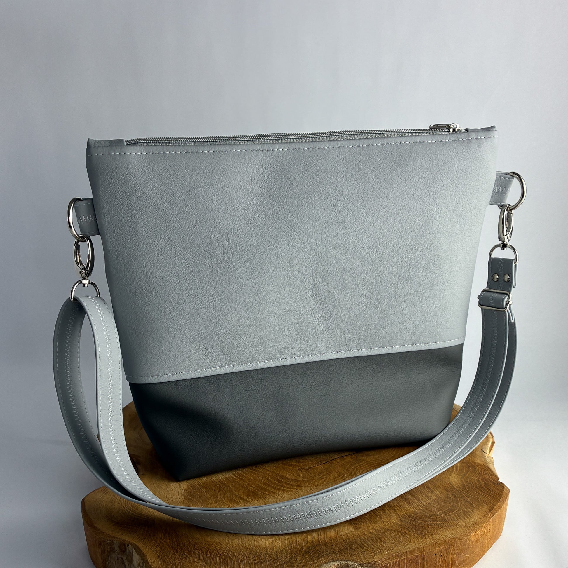 Beide Taschen haben oben einen Reißverschluss und einen verstellbaren Schultergurt (60–130 cm). Der Schultergurt ist ca. 2,5 cm breit und ebenfalls aus Kunstleder selbst genäht, passend zur Tasche.