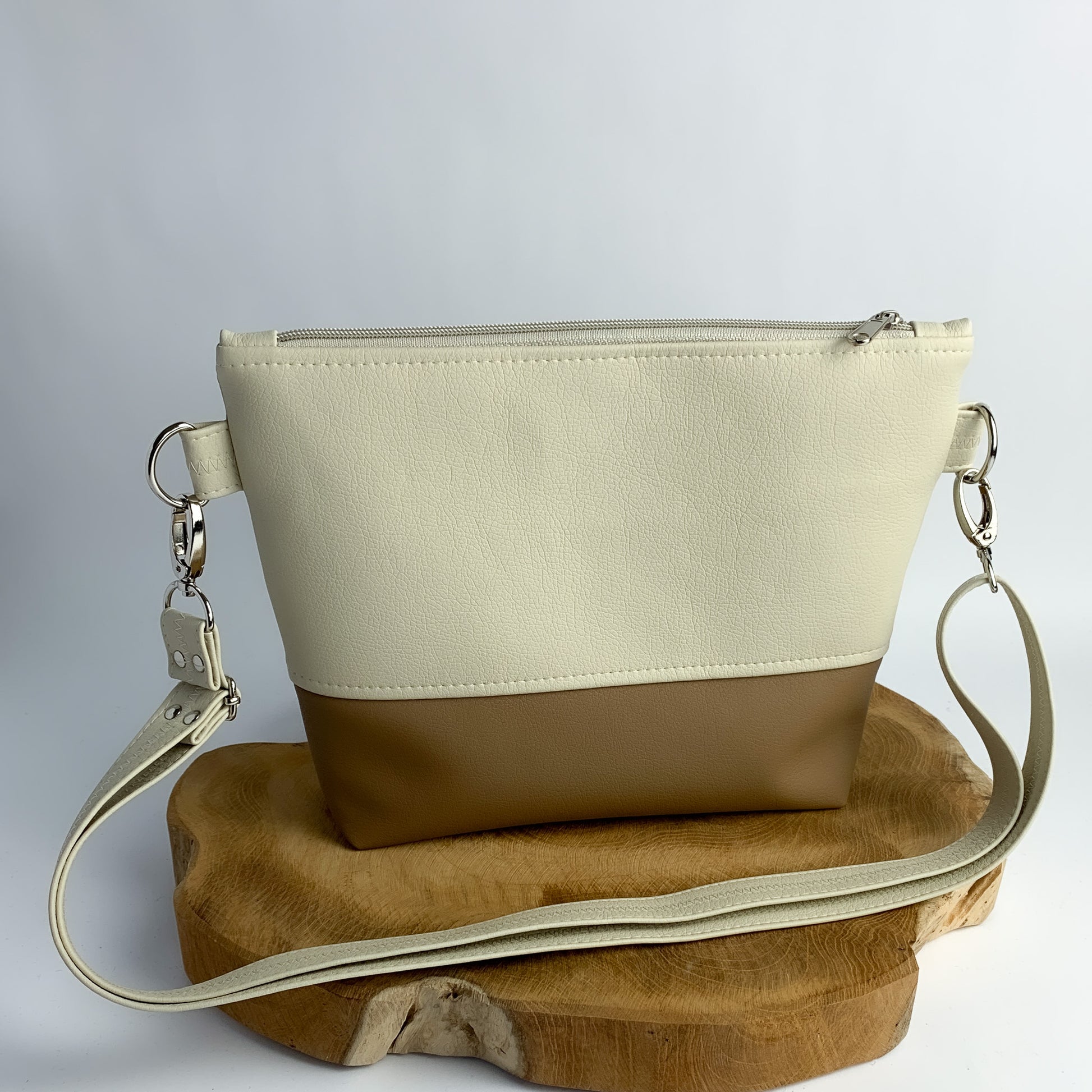 Beide Taschen haben oben einen Reißverschluss und einen verstellbaren Schultergurt (60–130 cm). Der Schultergurt ist ca. 2,5 cm breit und ebenfalls aus Kunstleder selbst genäht, passend zur Tasche.