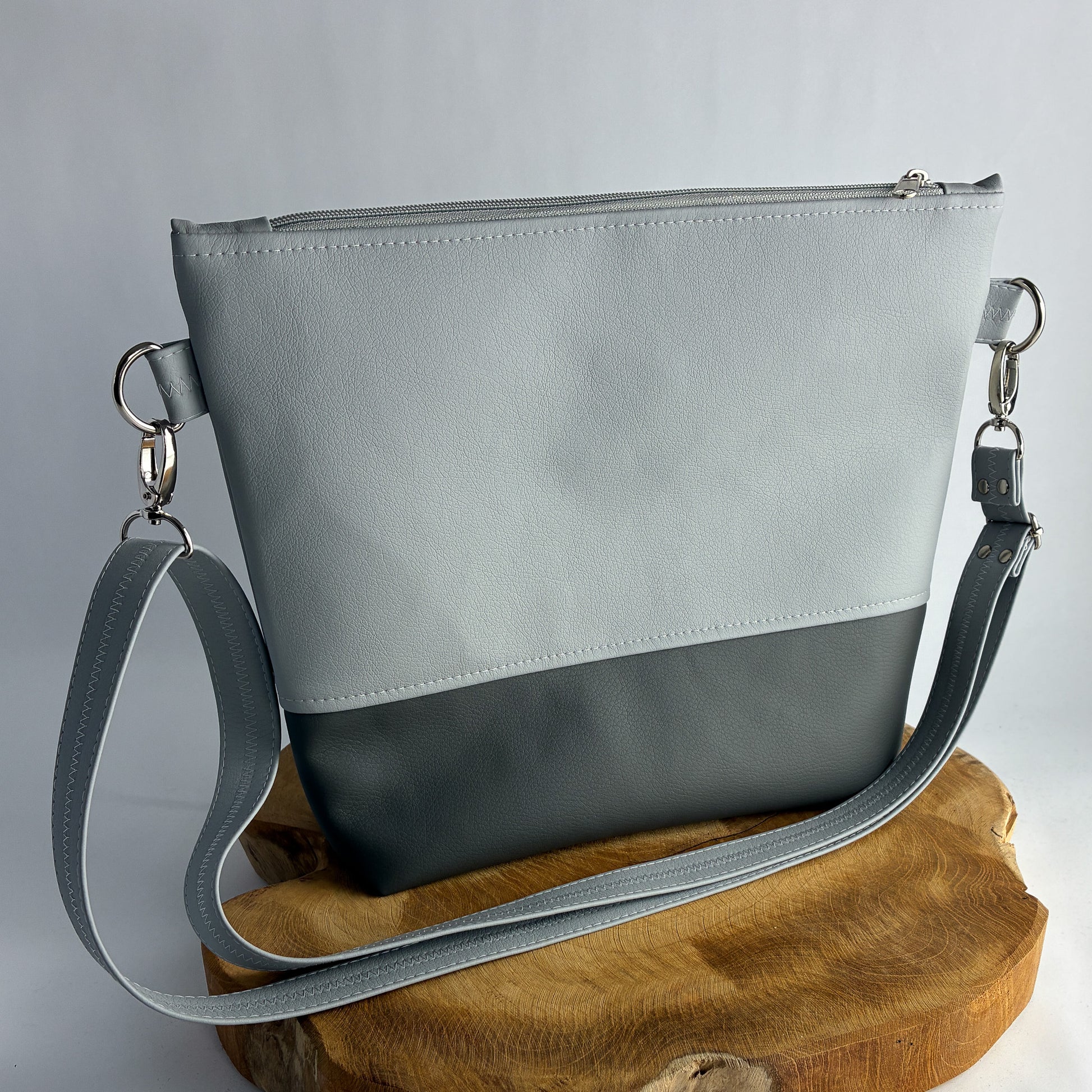 Beide Taschen haben oben einen Reißverschluss und einen verstellbaren Schultergurt (60–130 cm). Der Schultergurt ist ca. 2,5 cm breit und ebenfalls aus Kunstleder selbst genäht, passend zur Tasche.