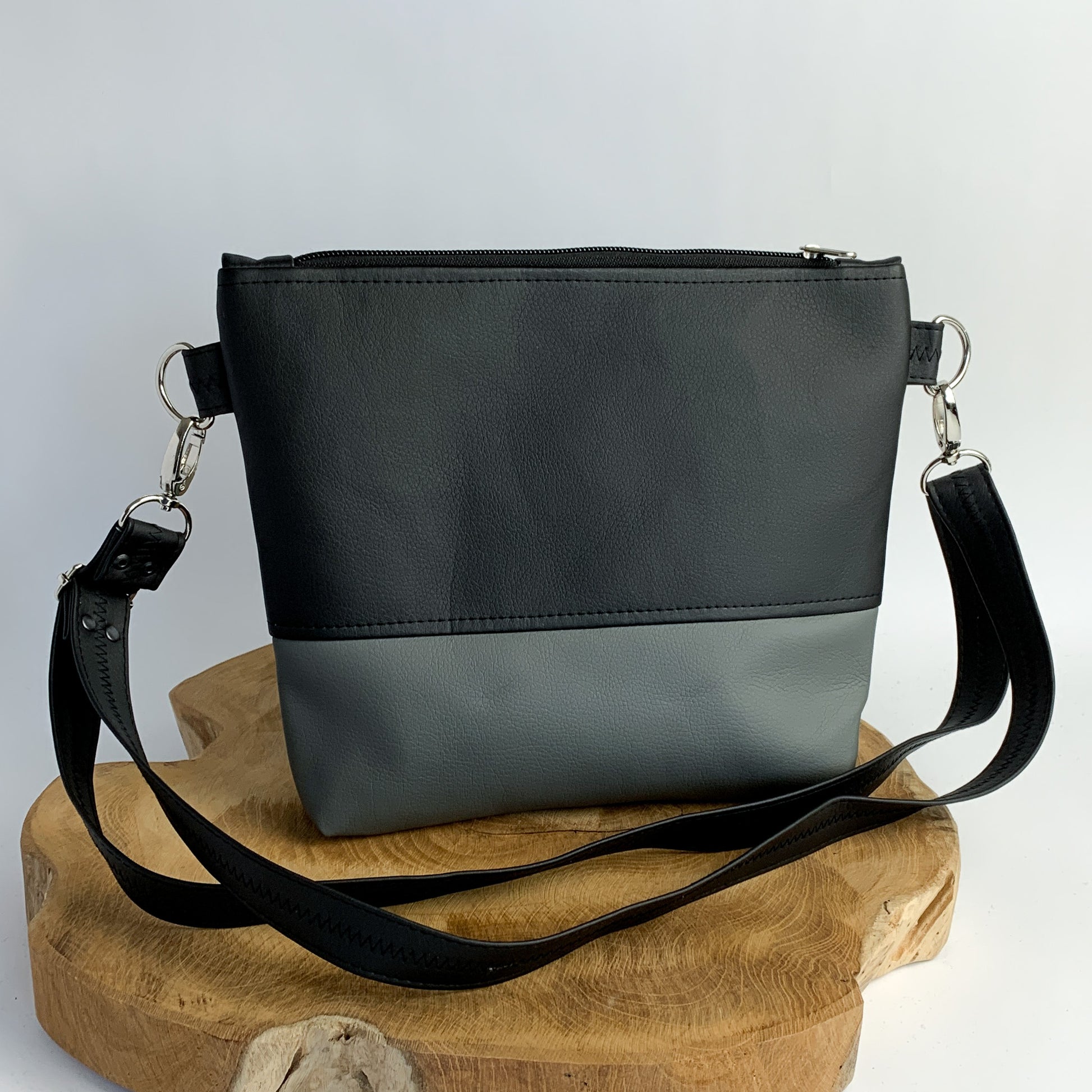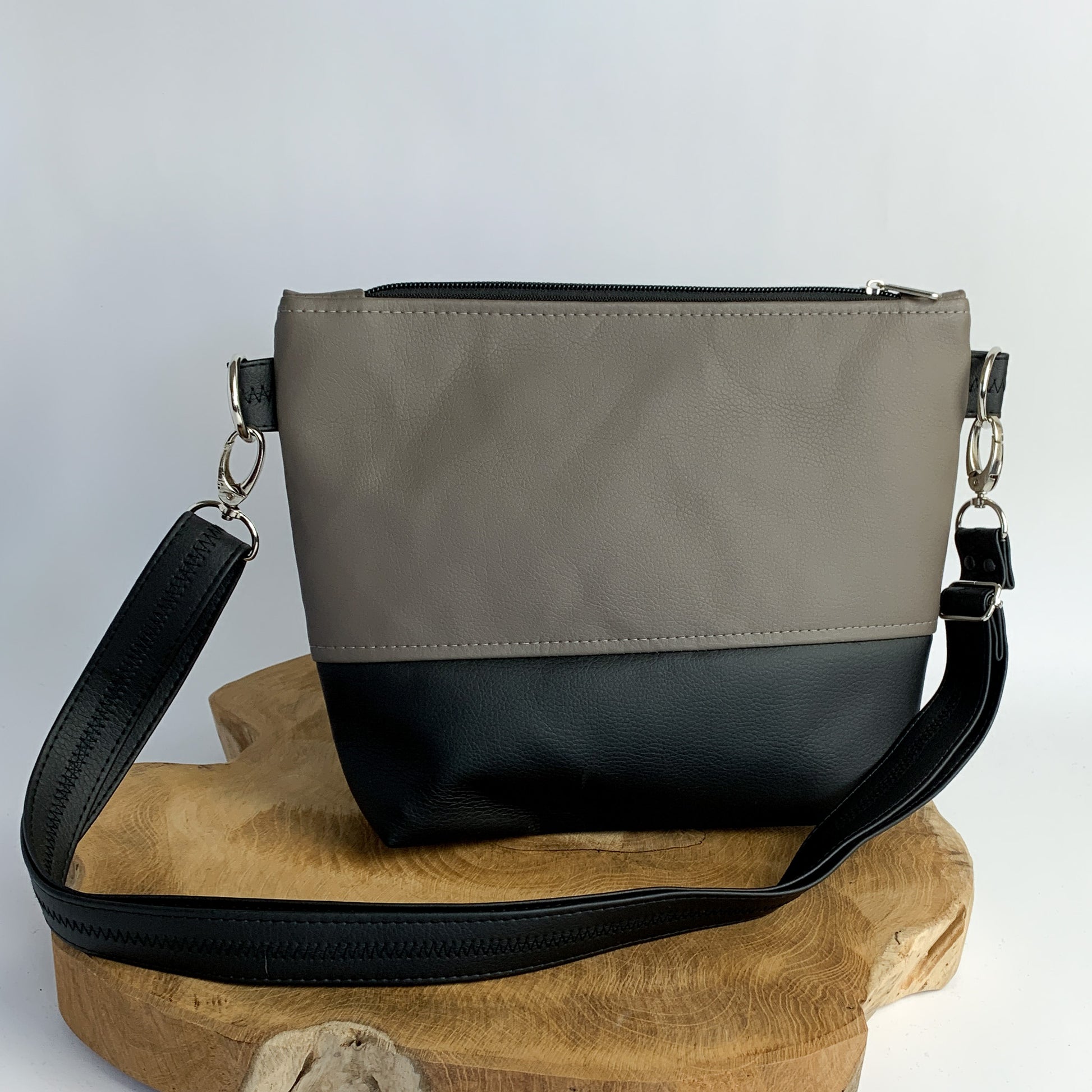Beide Taschen haben oben einen Reißverschluss und einen verstellbaren Schultergurt (60–130 cm). Der Schultergurt ist ca. 2,5 cm breit und ebenfalls aus Kunstleder selbst genäht, passend zur Tasche.